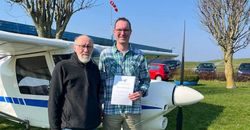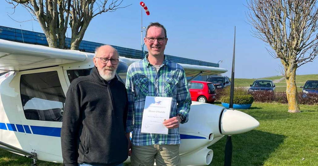Im Rahmen der Mitgliederversammlung des Premium Aerotec „Weser“ Luftsportverein e.V. wurde Fluglehrer Tim Wührmann für 40 Jahre fliegerische Tätigkeit geehrt. Der 1. Vorsitzende Karl-Ulrich Evers gratulierte im Namen des Vereins und überreichte ihm die Ehren-Urkunde mit goldener Anstecknadel des Luftsportverbandes Niedersachsen. Tim begann bereits im Alter von zehn Jahren in Blexen mit dem Modellflug. Nach Erreichen des Mindestalters konnte er mit der Ausbildung zum Segelflugpiloten beginnen und schließlich die Lizenz zum Führen von Luftfahrzeugen erwerben. Bis heute ist er dem Luftsport eng verbunden und engagiert sich weiterhin ehrenamtlich als Fluglehrer und Prüfer.