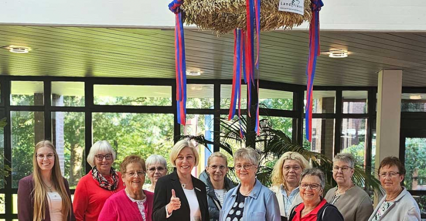 wk – Mit dem Ende des Erntejahres hat der KreisLandFrauenverband Ammerland-Varel Landrätin Karin Harms die diesjährige Erntekrone übergeben. Das kunstvolle Werk schmückt nun das Foyer des Kreishauses und erinnert Besucherinnen und Besucher in den kommenden Wochen an die enge Verbundenheit zwischen Landwirtschaft, Tradition und Region.