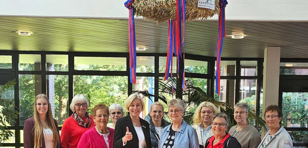 wk – Mit dem Ende des Erntejahres hat der KreisLandFrauenverband Ammerland-Varel Landrätin Karin Harms die diesjährige Erntekrone übergeben. Das kunstvolle Werk schmückt nun das Foyer des Kreishauses und erinnert Besucherinnen und Besucher in den kommenden Wochen an die enge Verbundenheit zwischen Landwirtschaft, Tradition und Region.